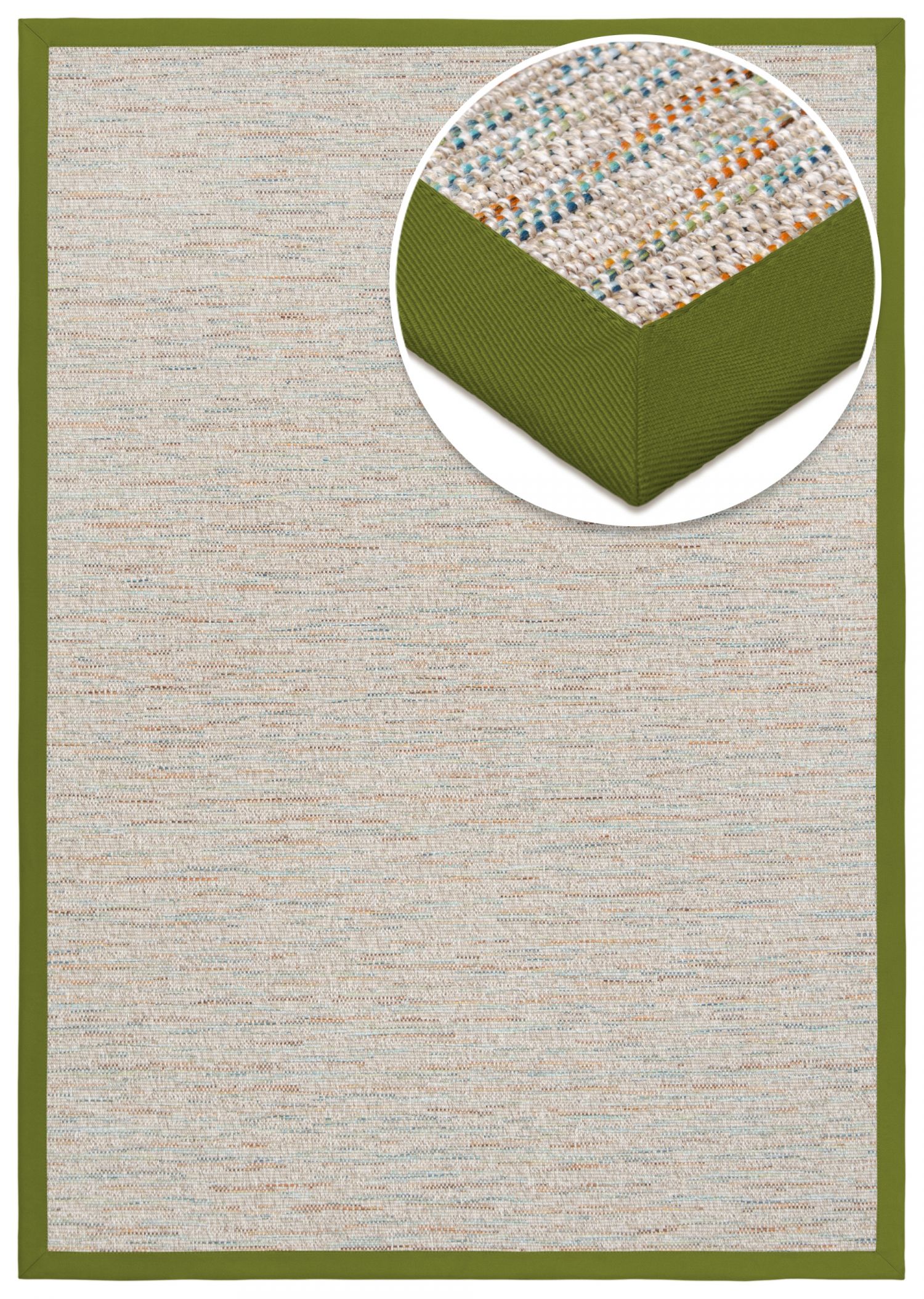 Durch die moderne Webart entsteht ein dezentes, aber wechselhaftes Muster. Es wird von weiß-hellgrau melierten Kettfäden dominiert, welche von bunten (nicht aber zu knalligen) Schussfäden durchstoßen werden. Diese bestehen aus feinen gefärbten Monofilamenten und die Blau-, Grün- und Erdtöne gehen sanft ineinander über. Die unregelmäßigen Hebungen der Fäden schaffen den perfekten Übergang zwischen dezentem Look und lebensfrohem Farbstich. Definitiv ein Teppich mit dem „gewissen Etwas”.